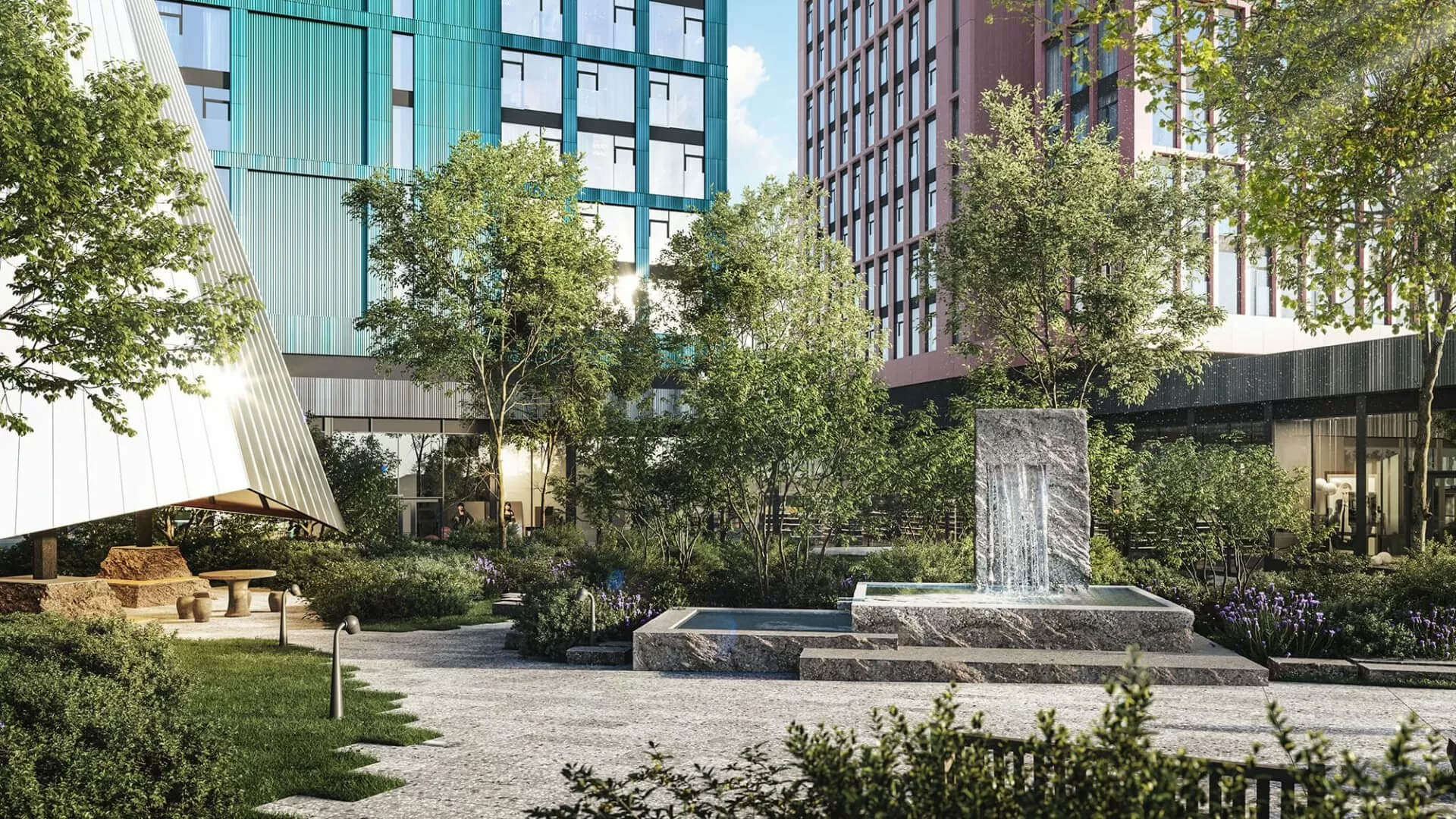 Среди пышной зелени обустроены холмы и лужайки, уютные детские площадки, скамейки и столы. Каждая деталь дизайна подчеркивает эстетику и комфорт пространства. Дворы City Bay — территория, где природа становится частью городской жизни.