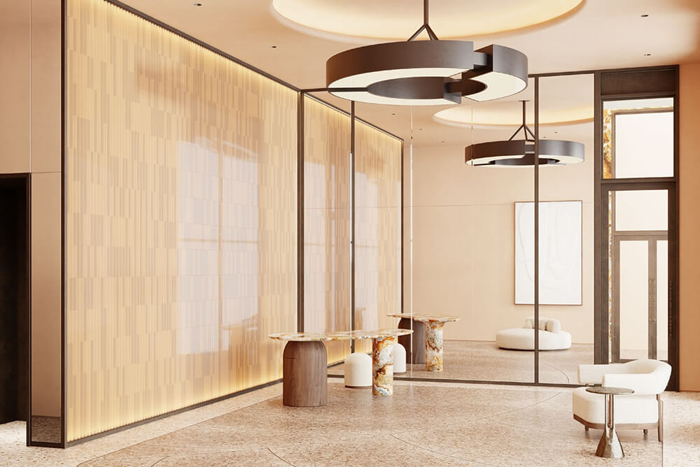 Лобби жилого комплекса City Bay — это пространство, где каждая деталь подчеркивает атмосферу уюта и премиального стиля. Высокие потолки и панорамные окна наполняют вестибюли естественным светом, создавая эффект простора. Уникальные световые решения и продуманное освещение добавляют интерьеру динамичность и акценты.