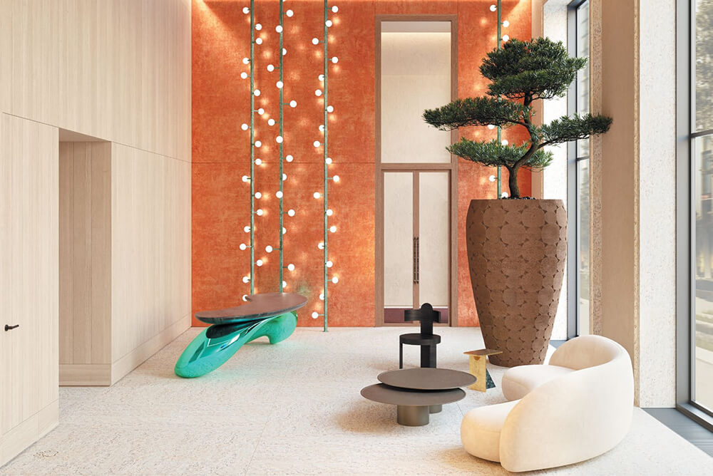 Для отделки использованы натуральные материалы: камень, дерево и глина, которые сохраняют тепло природы. Текстуры натуральных тканей и объемная керамическая плитка дополняют интерьер, делая его тактильно приятным и визуально гармоничным. Элементы из меди и цветной стали придают лобби элегантный характер, подчеркивая современный дизайн.