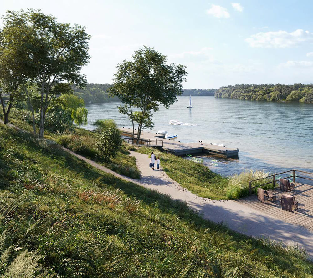 Основной акцент набережной — понтонный причал, расположенный прямо у главной площади комплекса. Это место станет точкой притяжения для жителей и гостей, идеально подходя для прогулок и любования речными пейзажами.