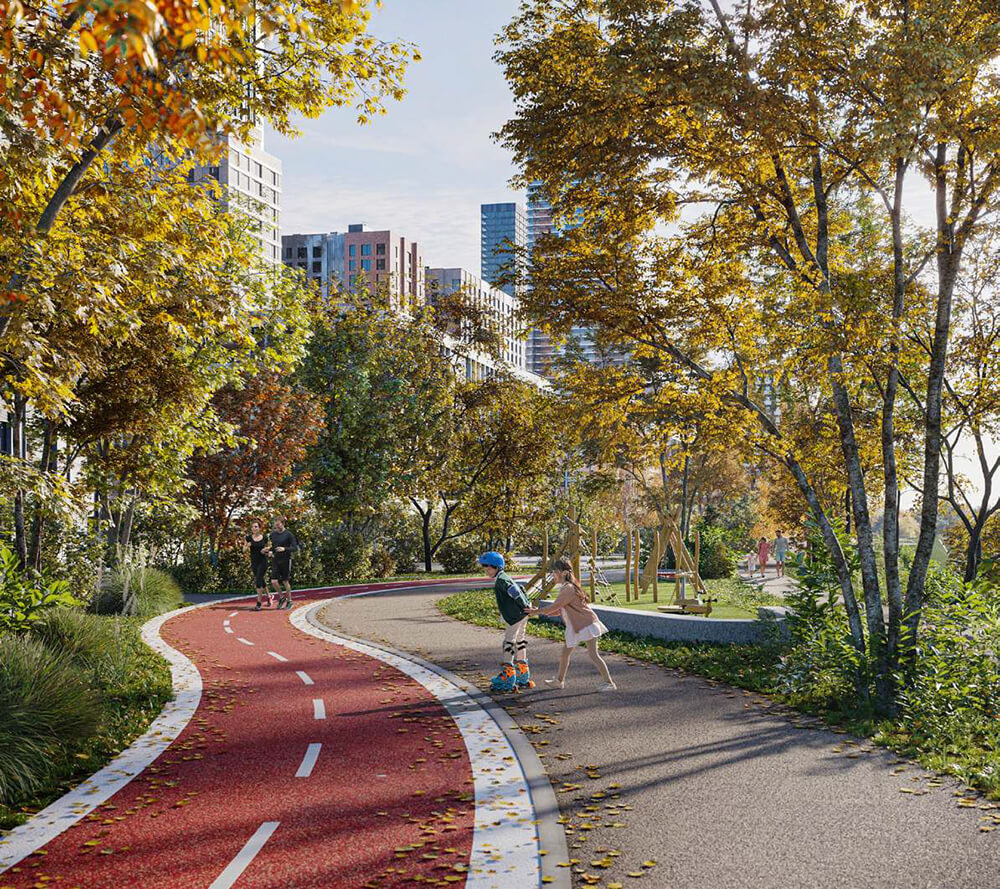 Набережная City Bay — это уникальное пространство для отдыха, спорта и общения у воды. Вдоль берега Москвы-реки будет создан современный парк, который станет связующим звеном между всеми кварталами жилого комплекса. Здесь предусмотрены велосипедные и беговые дорожки с качественным покрытием, пешеходные маршруты и лесные тропы, оборудованные смотровыми балконами и уютными деревянными скамейками.