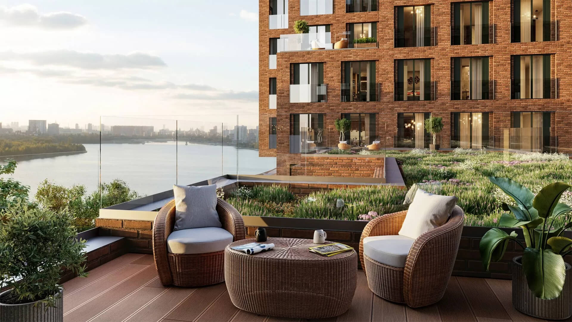 Ландшафтные дизайнеры предусмотрели благоустроенные крыши, соединяющие корпуса комплекса, чтобы создать зеленые зоны для отдыха и насладиться захватывающими панорамами города. Террасы с видом на город и окружающий ландшафт добавляют особую атмосферу комфорта и уединения.
